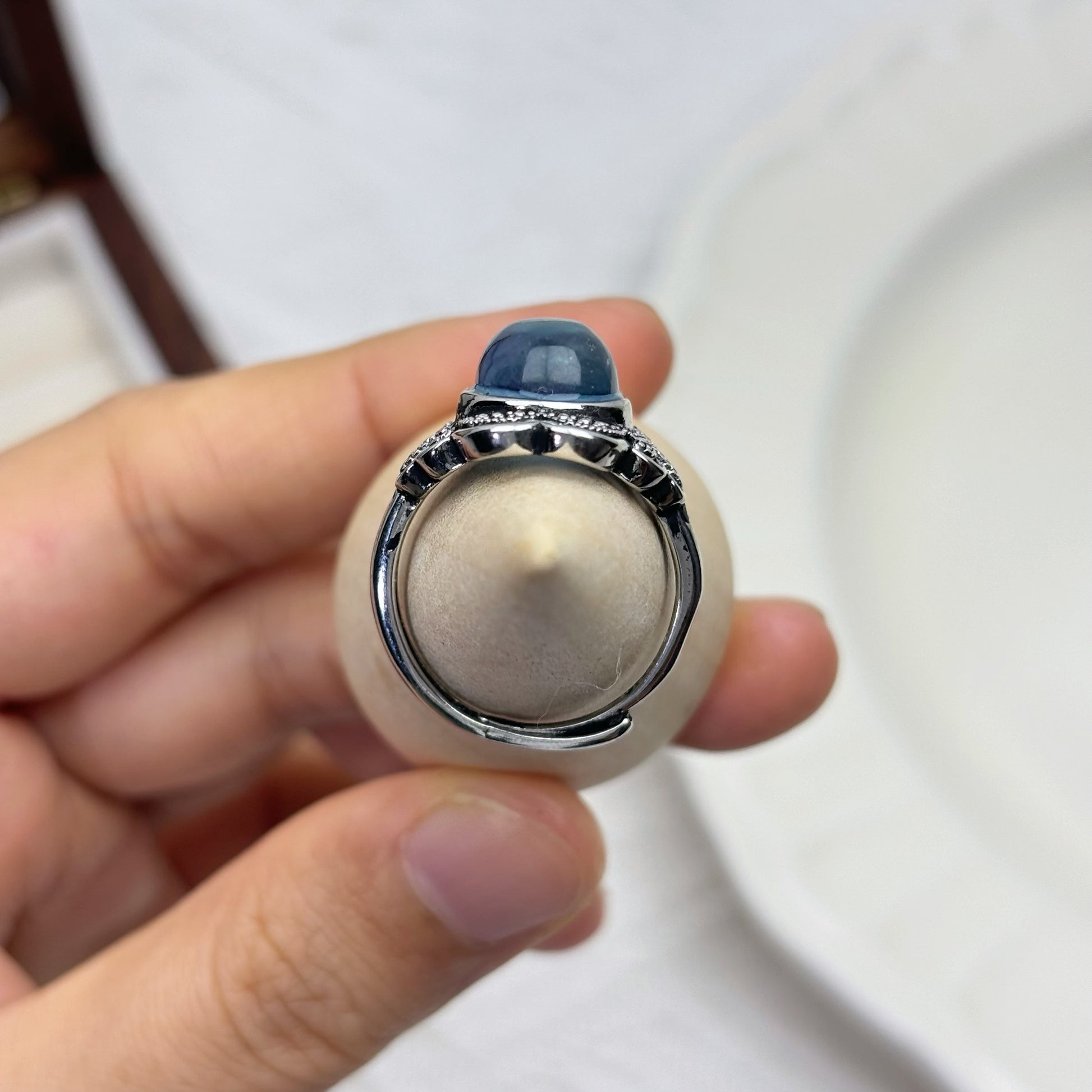 A true statement of elegance, this ornate silver-plated ring features a natural aquamarine cabochon framed by vintage-style lace detailing. Adjustable for the perfect fit, it blends classic beauty with a touch of mystique.